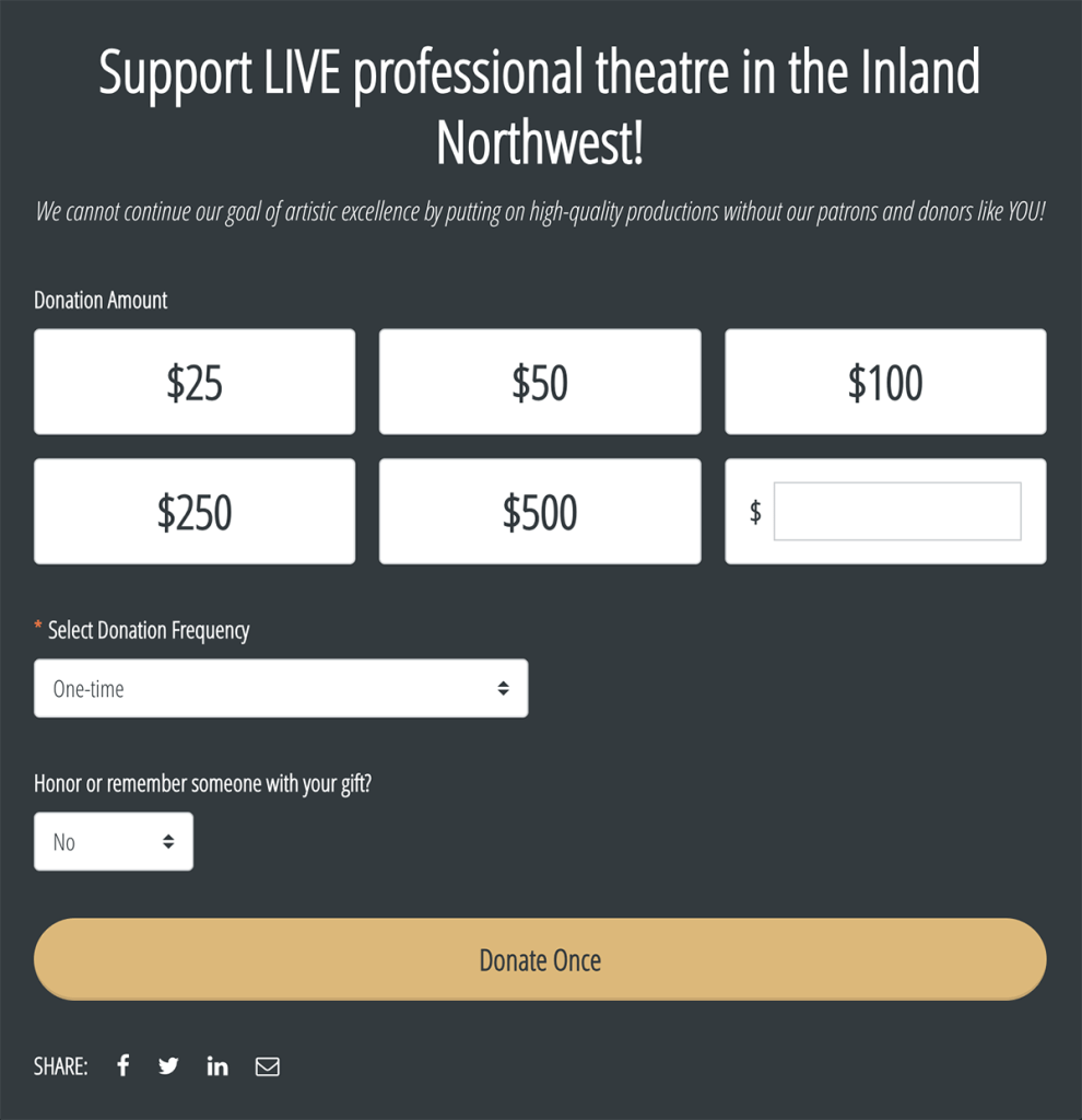 Your generosity fosters our creativity! Spokane Valley Summer Theatre is a 501(c)3 non-profit, so all your gifts are tax-deductible. We thank you for your continued generosity in supporting performing arts in the Greater Spokane Region!